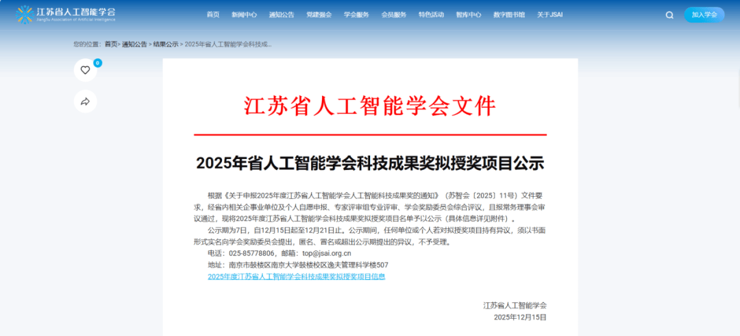 公示了2025年省人工智能学会科技授项目名单。